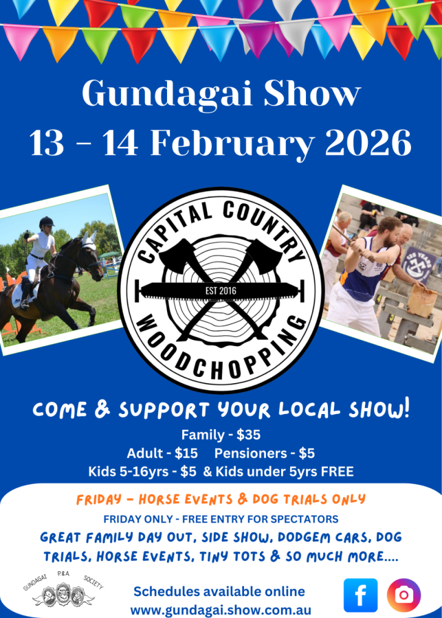 The President and Committee of the Gundagai P&A invite everyone to our 134th Annual show which kicks off on Friday 13 February, 2026 with horse events & dog trials and the main day being Saturday 14 February 2026. Be sure to save the date….
